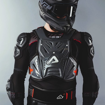 Debajo de la camiseta técnica, el uso de un peto integral es fundamental para resguardar el pecho, la espalda y los hombros. Los protectores modernos utilizan espumas inteligentes que se endurecen instantáneamente al recibir un impacto, ofreciendo flexibilidad durante el movimiento y una rigidez extrema ante un golpe. Asimismo, el protector cervical o «neck brace» se ha estandarizado en la disciplina para evitar movimientos bruscos del cuello que podrían derivar en lesiones medulares, limitando la hiperflexión y la hiperextensión de la cabeza en caso de una parada repentina.